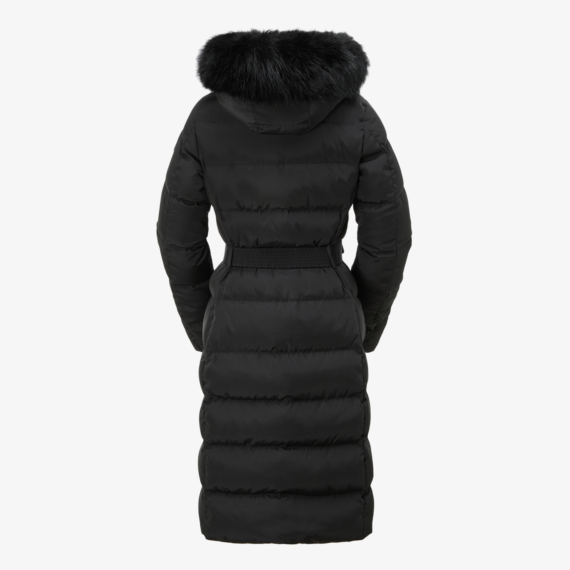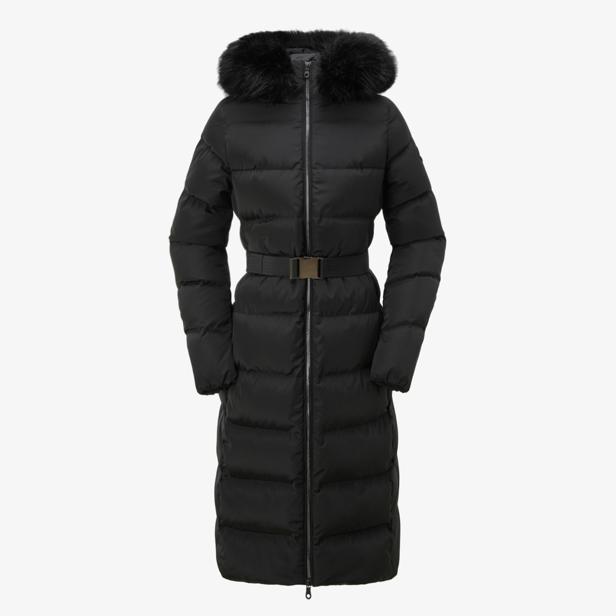 여성스러운 실루엣으로 디자인된 무릎 기장의 다운 코트입니다.