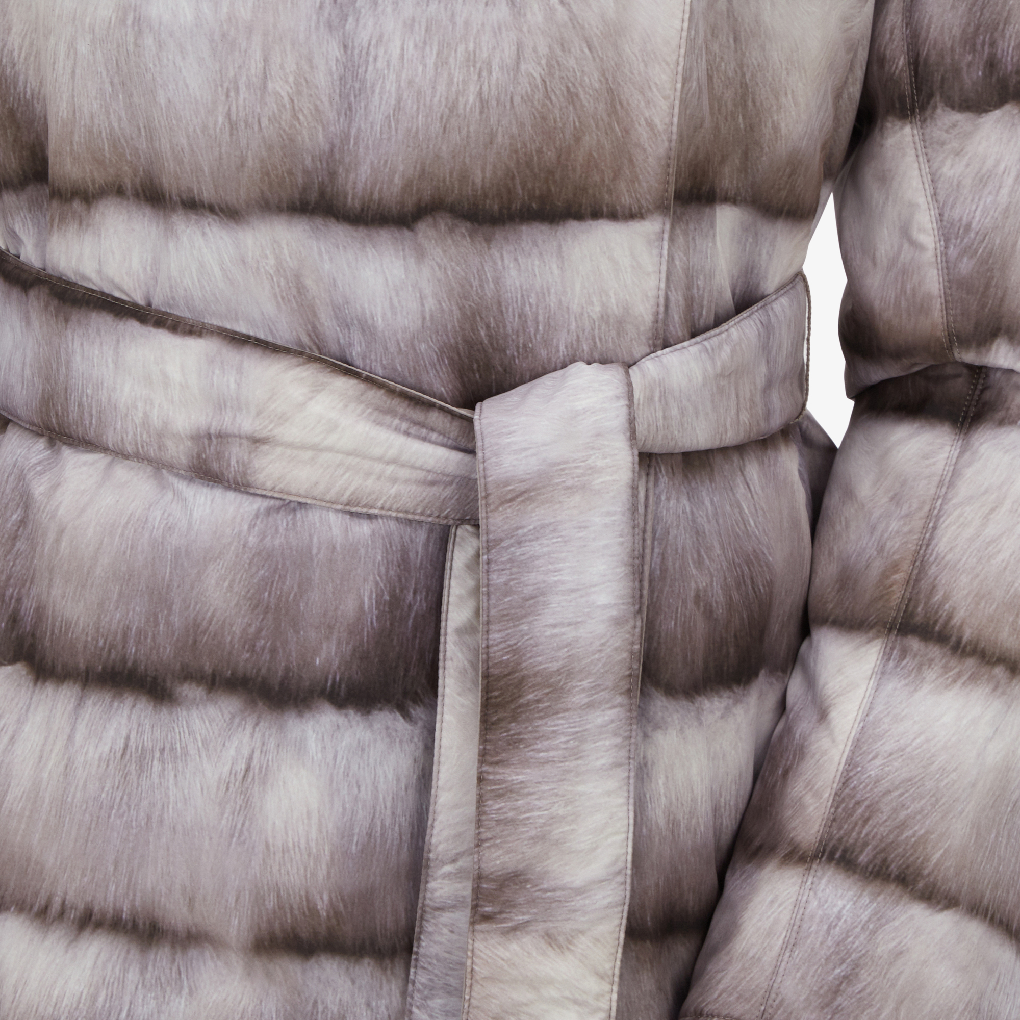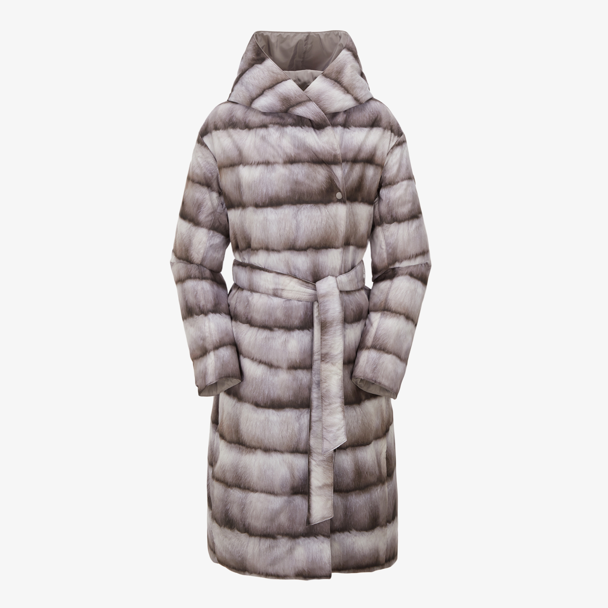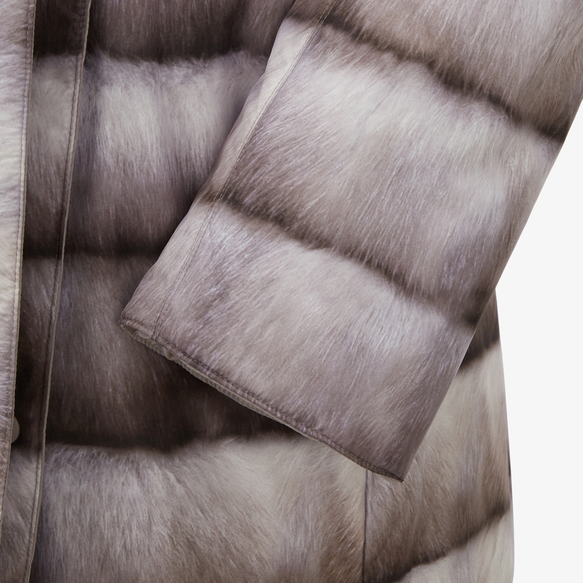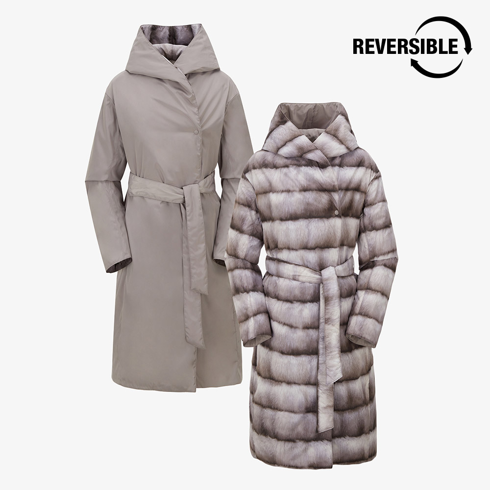 양면으로 착용 가능한 여성 리버시블 패딩 코트로 밍크 외관의 프린트면 착장 시 화려한 연출, 솔리드 면 착장 시 심플하고 고급스러운 연출이 가능합니다.