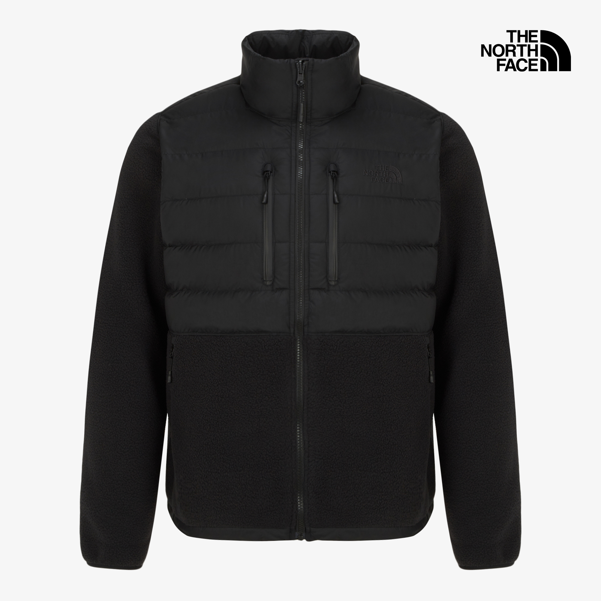 상단 우븐 퀼팅 부분에 다운 충전재를 적용하여 보온성을 강화한 하이브리드 플리스 자켓입니다.