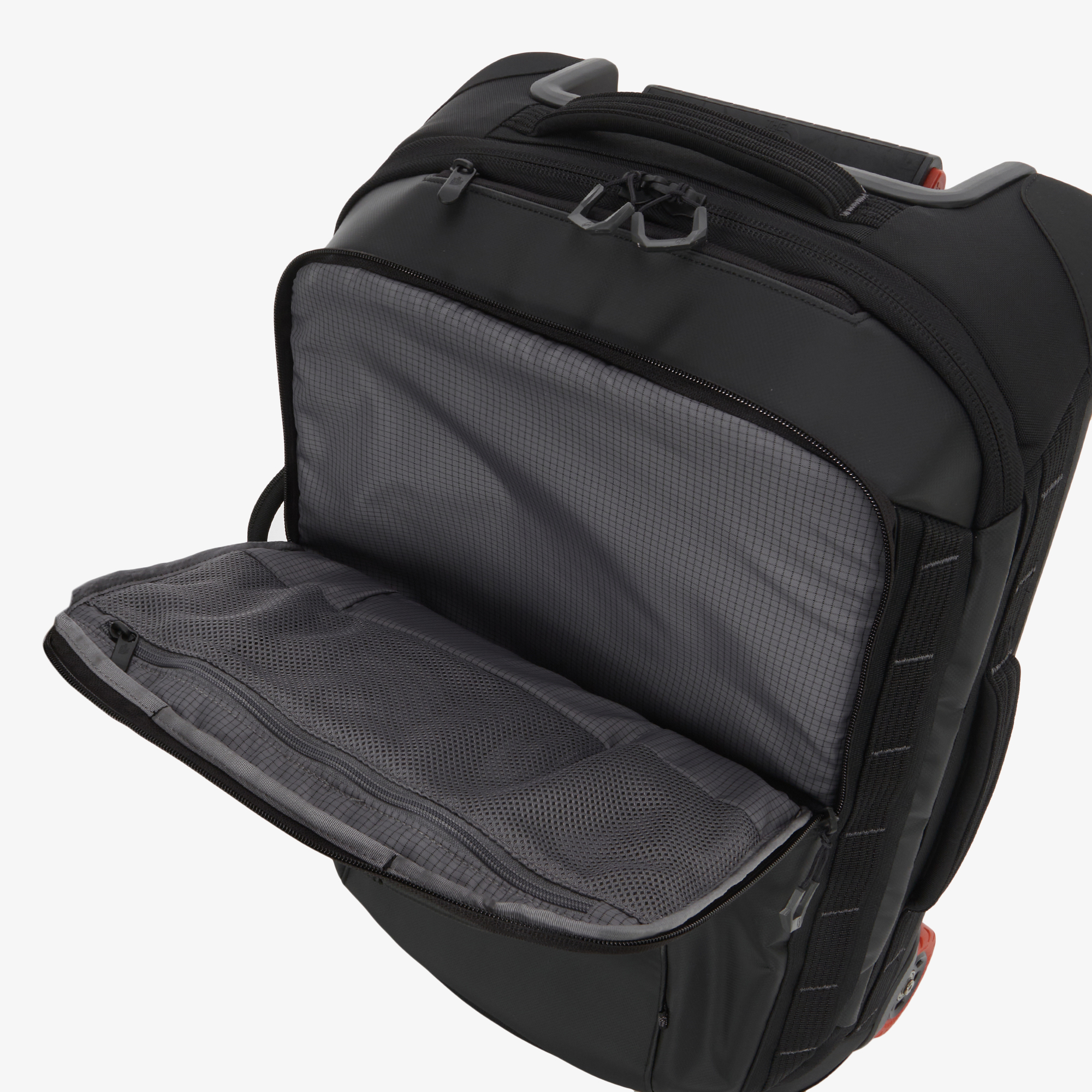 클램쉘 구조와 길게 설계된 지퍼로 내부 접근성을 높였고, 16인치 노트북 수납 슬리브, 내부 압축 패널과 메쉬 지퍼 포켓, 외부 퀵 액세스 포켓 등 체계적인 수납 구성을 갖췄습니다.