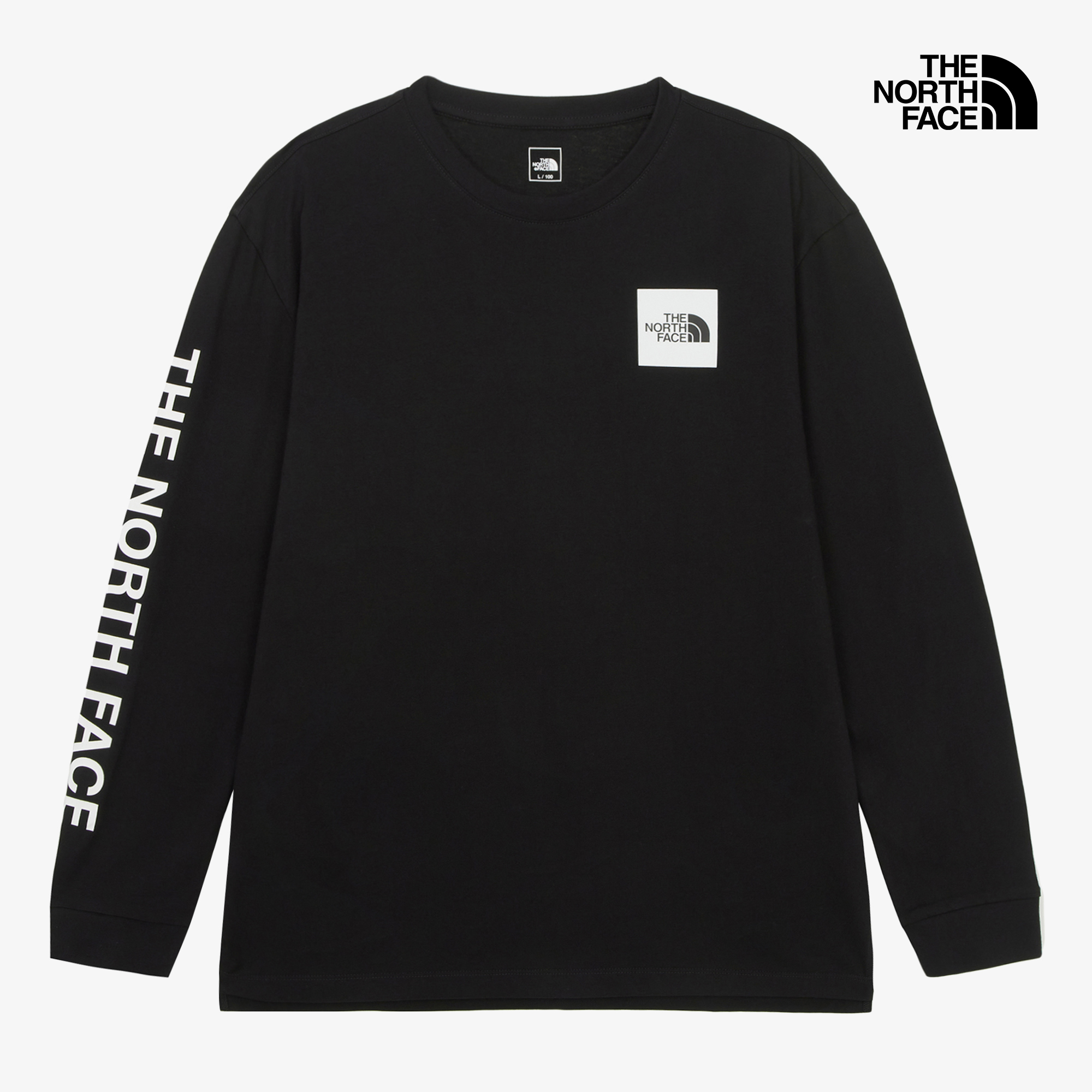 사이드 슬릿과 노스페이스 사각 로고, 그리고 슬리브의 레터링 프린트가 특징입니다.