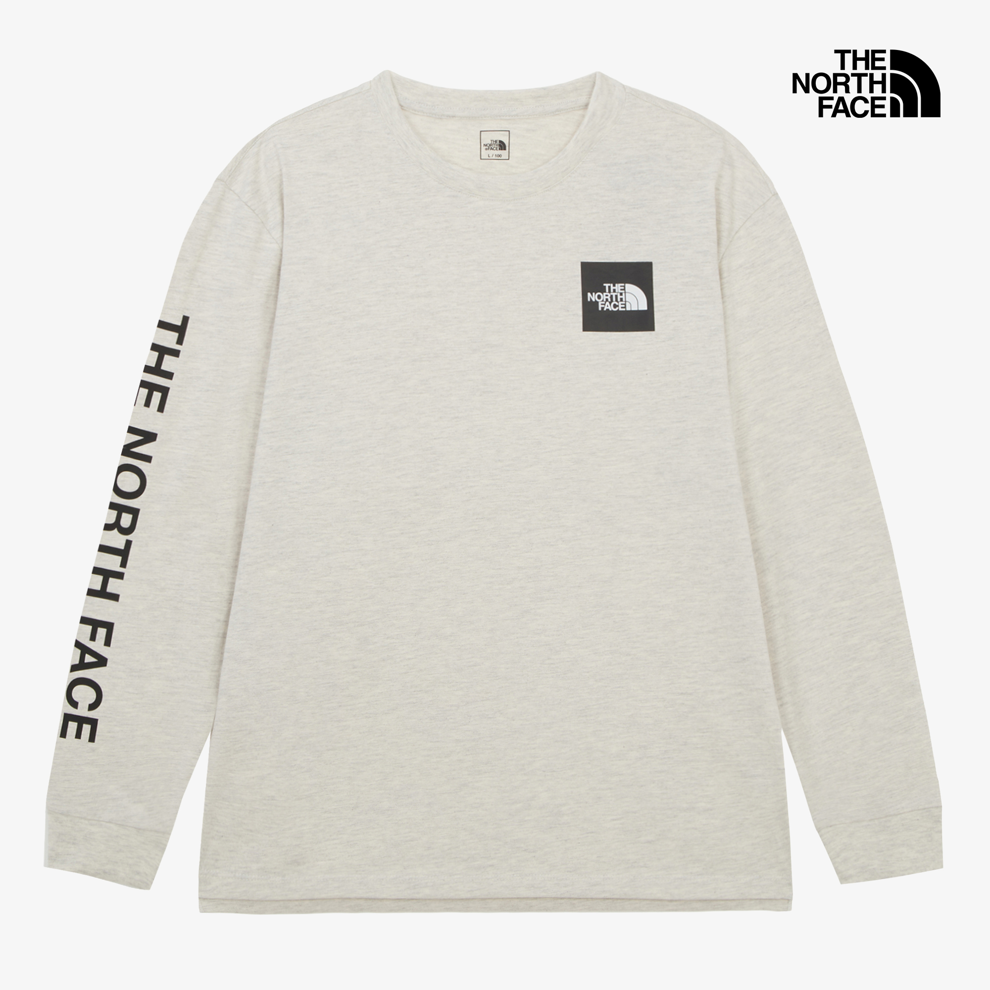 사이드 슬릿과 노스페이스 사각 로고, 그리고 슬리브의 레터링 프린트가 특징입니다.