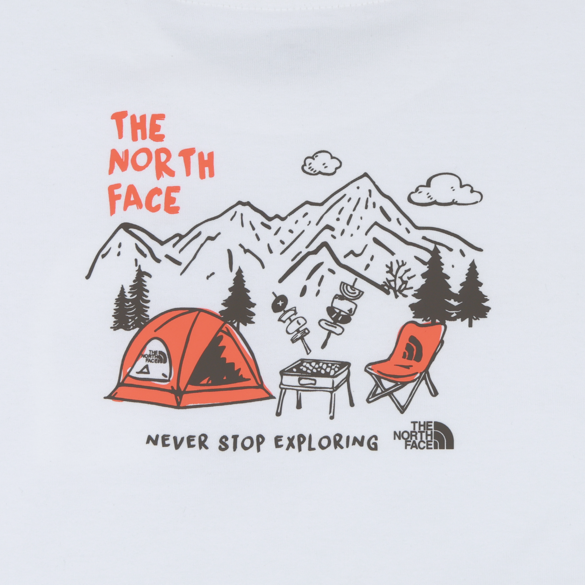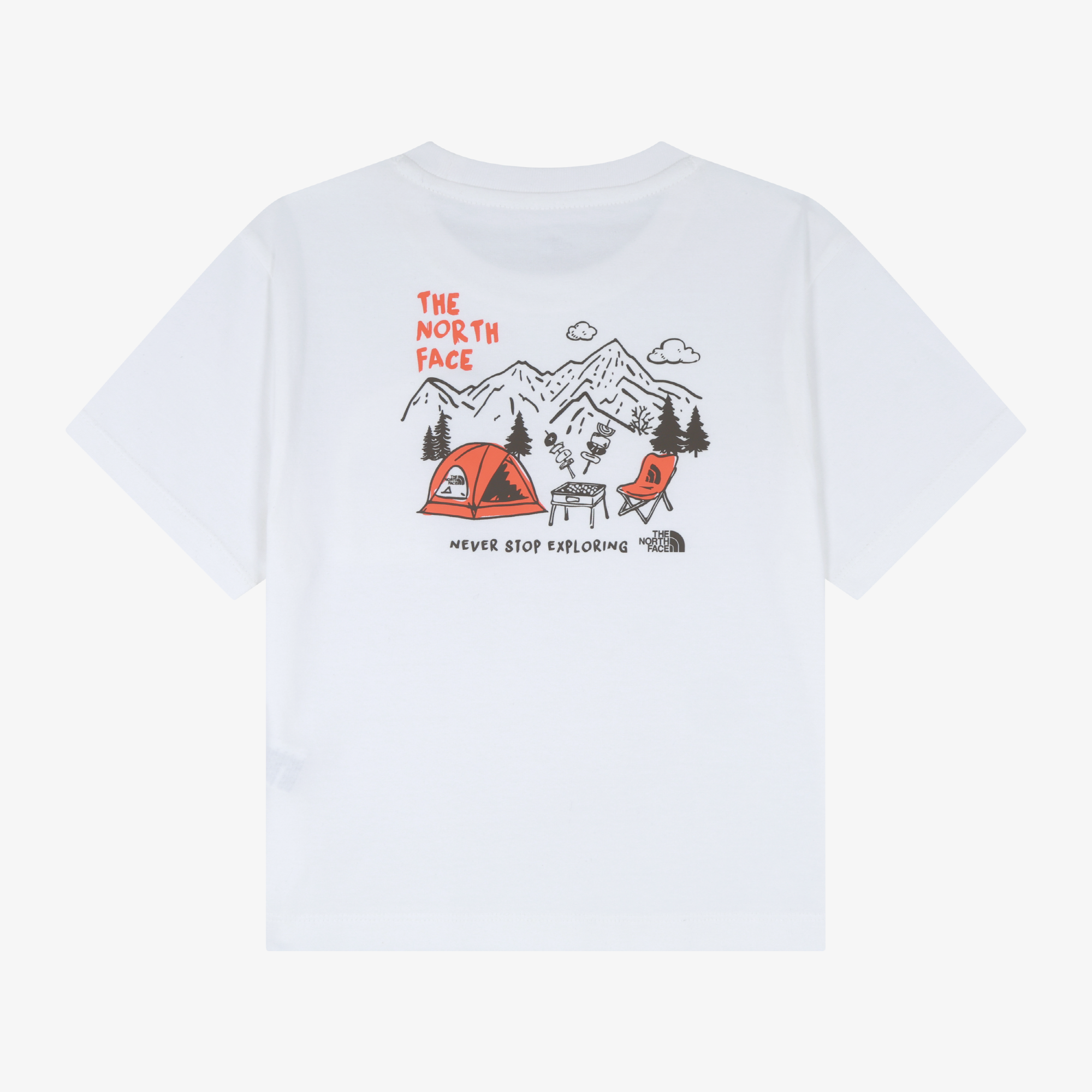 하프돔 모양의 가슴 포켓과 뒷판 캠핑 그래픽 포인트의 반팔 티셔츠와