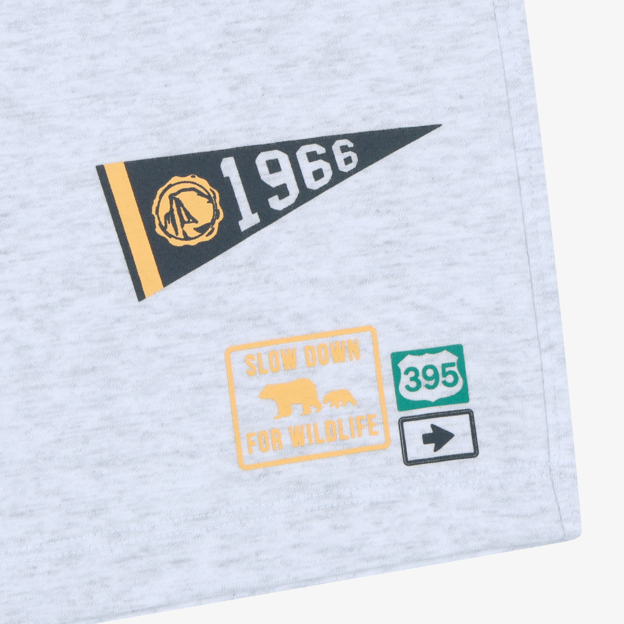 레터링과 깃발 그래픽 포인트가 돋보이는 반팔 티셔츠와 반바지 셋업 제품으로,